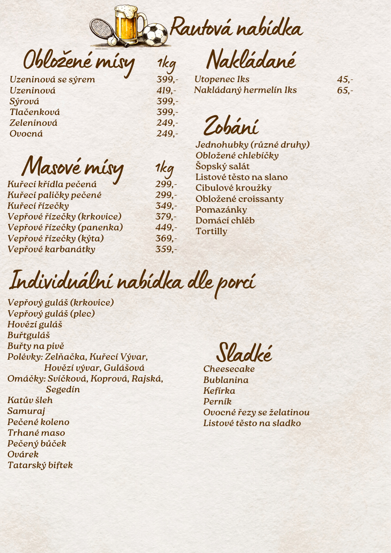 Raut vám rádi přizpůsobíme podle počtu osob, typu akce i vašich přání. Společně vymyslíme ideální kombinaci tak, aby vše dávalo smysl – chuťově, množstvím i cenově.
