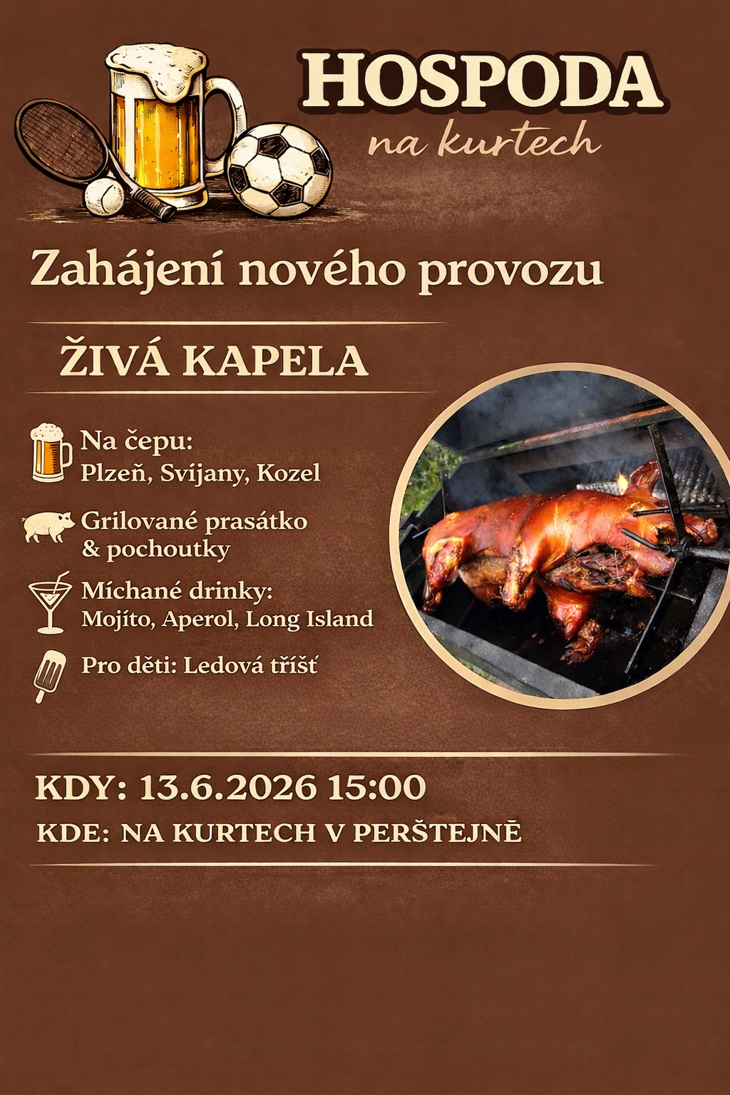 Přijďte s námi oslavit a symbolicky "pokřtít" znovuotevření hospody na kurtech! Připravili jsme pro vás odpoledne a večer plný pití a pohodové atmosféry, jakou máme nejradši.